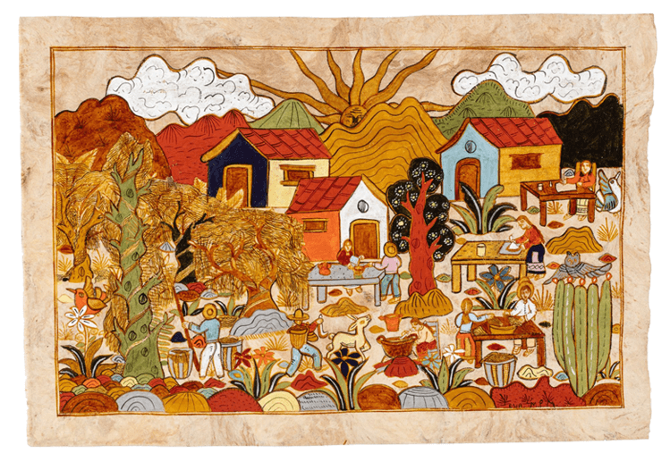 Image credits: Eva Peréz Martínez. Zacatlaxcalli Vignette, Nahua, Mexico, Guerrero, Xalitla, 2023.  Watercolor on amate, 7 7/8 x 11 3/4 inches (20 x 30 cm). Los Angeles County Museum of Art, commissioned with funds provided by Lillian Weiner. © Eva Peréz Martínez, photo © Museum Associates/LACMA, by Javier Hinojosa.